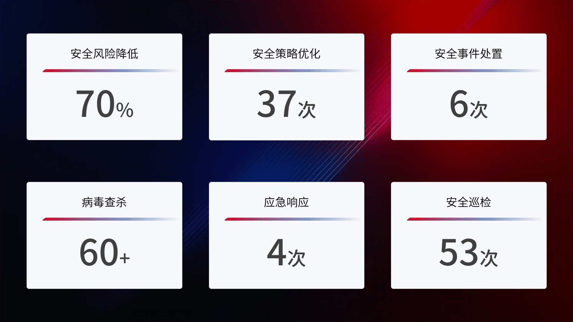 提供全面的安全事件报告体系,,包括处置报告、、、周报、、、、季度和年度总结,,结合持续监控,,,,帮助客户深入了解网络安全状况。。